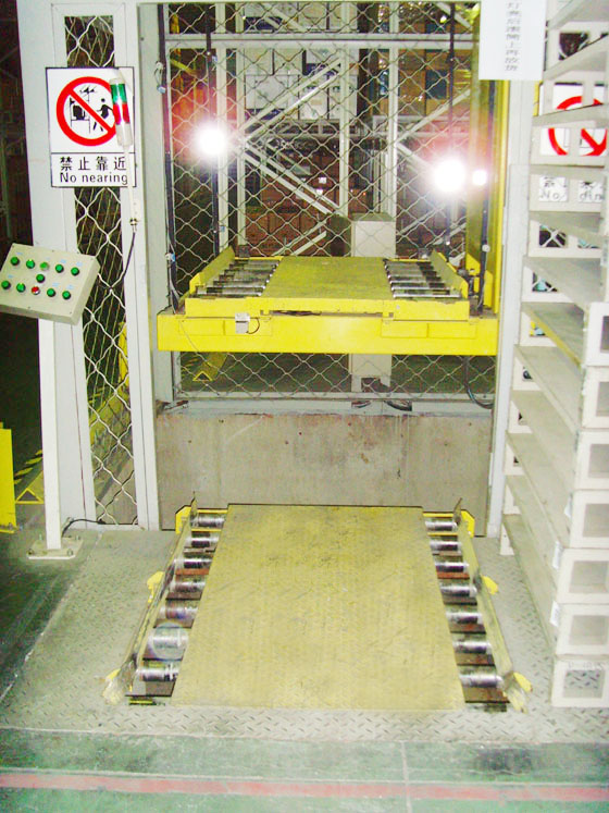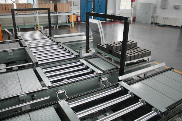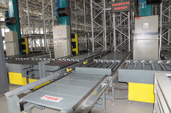 ·入出库输送机系统是将入库托盘货物输送至堆垛机作业原始位置或将出库托盘货物输送至出库端口的水平输送设备。由平行于巷道的链式输送机、垂直于巷道的辊式输送机、它们连接处的曲柄式辊子升降台、自动分配车等组成。